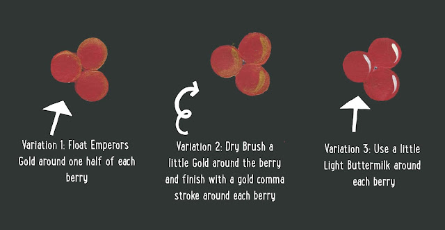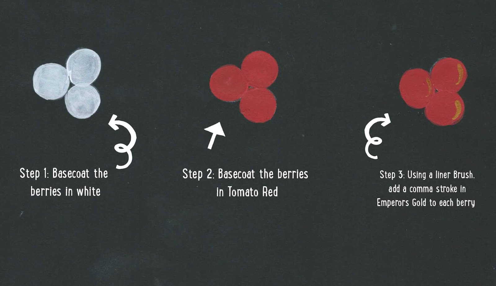 Basecoat your berries however you feel comfortable. Use 'C' strokes with the Flat or Angle brush or comma strokes using a round brush. Again, you will probably find that you need to give them two coats of red before adding the finishing touches. If you do not feel confident to use the liner brush, create a comma stroke using the small end of the dotting tool.