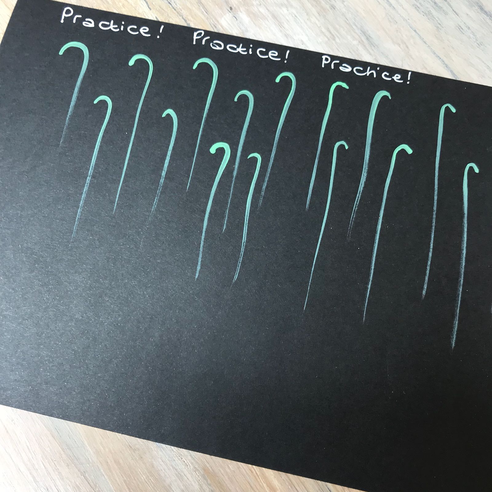 You are looking to paint a drooping stem, so imagine you are painting walking sticks. Practice painting them facing left and right, trying to keep the stems as straight as possible. Don't worry if your paint runs out a little at the end, you can always mask this when you add the comma stroke leaves